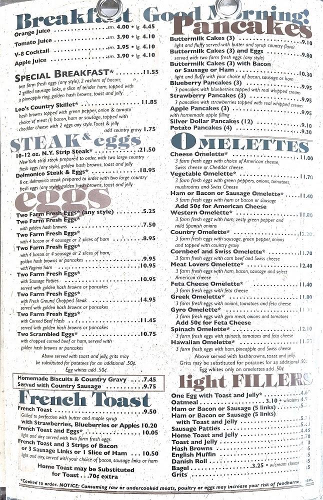 The menu at Leo's Country Oven features a diverse array of dishes. Breakfast options include classic eggs, omelets, and pancakes, served all day. Lunch and dinner menu items like gyros and hearty sandwiches provide plenty of choices. Pasta lovers will enjoy the Italian specialties like lasagna and ravioli. The diner also prides itself on desserts, with pies and comfort food staples present. This extensive offering ensures there's something for everyone, whether you're grabbing a quick bite or enjoying a leisurely meal.